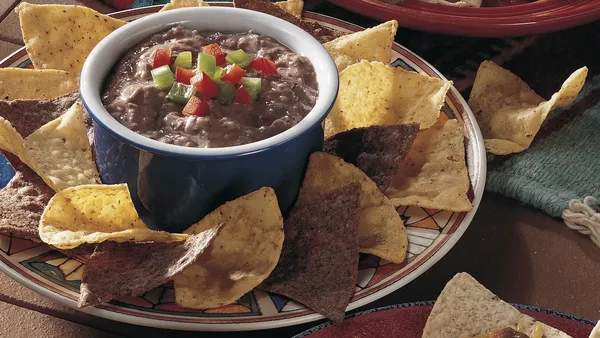 Step3Arrange eggs on bean mixture in ring around edge of plate; sprinkle with onion. Serve with tortilla chips.