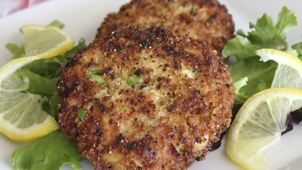 Step3In 10-inch nonstick skillet, heat oil over medium heat until hot. Add patties; cook 4 to 5 minutes on each side or until golden brown and thoroughly cooked. Drain on paper towels. Serve crab cakes topped with sauce. Garnish as desired.