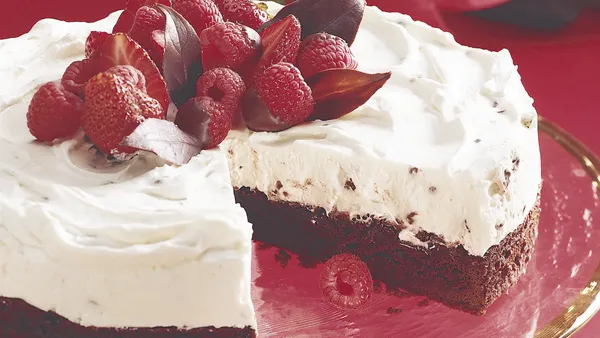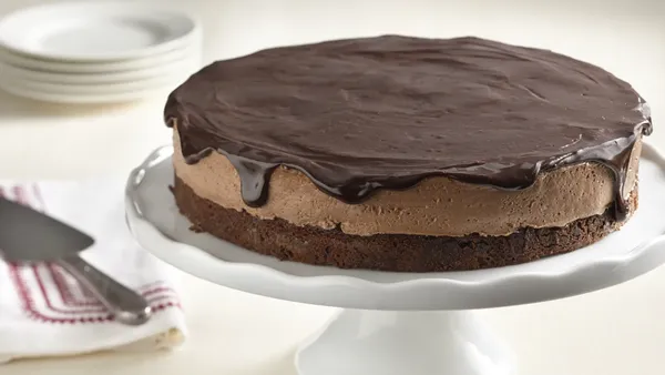 Step1Heat oven to 350°F. Wrap foil around outside of bottom and side of 10-inch springform pan to catch drips. Spray bottom only of pan with cooking spray. In large bowl, beat all base ingredients except chocolate chips with spoon 50 strokes; fold in chocolate chips. Spread in pan. Bake 35 to 40 minutes or until base pulls away from side of pan; do not overbake. Cool completely, about 1 hour 30 minutes.