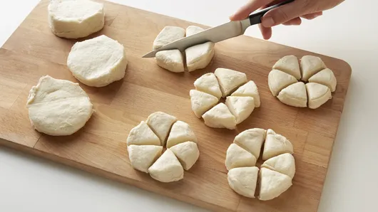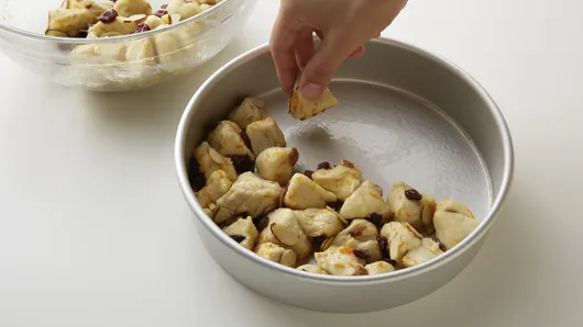 Step1Heat oven to 375°F. Generously spray 9-inch round cake pan with cooking spray. Separate dough into 8 biscuits. Cut each into 6 pieces. Place biscuit pieces in medium bowl. Pour 3 tablespoons melted butter over biscuits. Stir to coat.