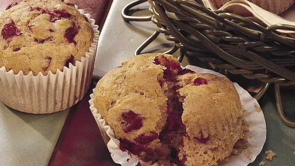 Step2In large bowl, stir together flour, sugar, baking powder and salt with whisk. Make well in center of dry ingredients. Add milk, oil, vanilla and egg; stir until combined (batter will be thick). Stir in cranberry sauce.