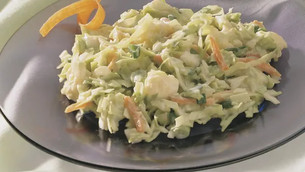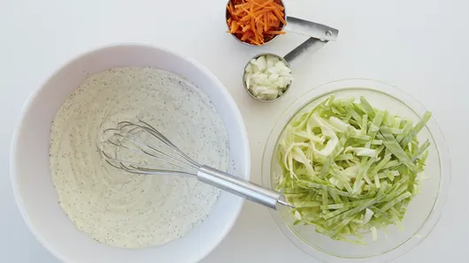 Step1Mix all ingredients except cabbage, carrot and onion in large glass or plastic bowl. Add remaining ingredients; toss until evenly coated.