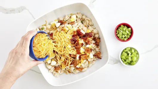 Step3Add pasta, eggs, bacon, cheese, celery and onions to dressing mixture in bowl; toss to gently coat. Serve immediately, or cover and refrigerate until serving.