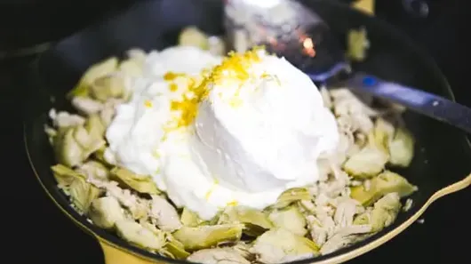 Step2Meanwhile, heat 12-inch skillet over medium heat. Drizzle olive oil into skillet. Add garlic; sauté 1 to 2 minutes or until fragrant. Add chicken and artichoke hearts; cook until thoroughly heated. Remove skillet from heat. Stir in yogurt, sour cream, lemon peel and pepper.