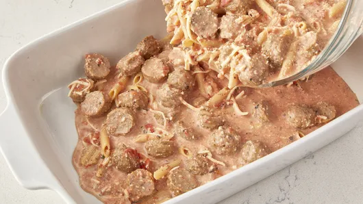 Step2Pour mixture into baking dish. Cover tightly with foil. Bake 30 minutes; stir, and replace foil. Bake 8 to 12 minutes longer or until pasta is tender and most of sauce is absorbed.