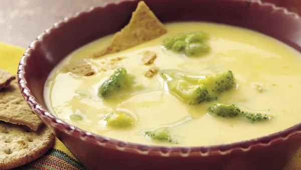 Here is a rich and satisfying cheese soup. Stilton cheese is the great English blue-veined cheese that ages to ivory-pale gold perfection.