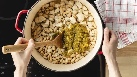 When your chicken is ready, add your chicken broth, beans, green chiles, and spices to the pot. Crank up the heat until it all comes to a boil, then turn it down and let the savory mixture simmer for 10-15 minutes. This will allow enough time for all those amazing flavors to come together.