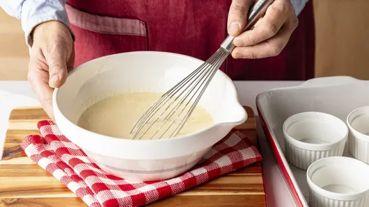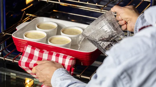 Pour liquid ingredients in slowly. As you’re adding the custard to the ramekins, too fast of a pour can make the custard spill or drip over the sides, which will cook inconsistently, and make a bit of a mess. Take care when adding the boiling water into the pan. You don’t want hot water splashing into the custard.