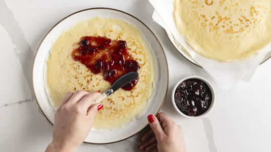 Step3Stack crepes, placing waxed paper between each; keep covered. Spread applesauce, sweetened berries, jelly or jam thinly over each warm crepe; roll up. (Be sure to fill crepes so when rolled the more attractive side is on the outside.) Sprinkle with powdered sugar.