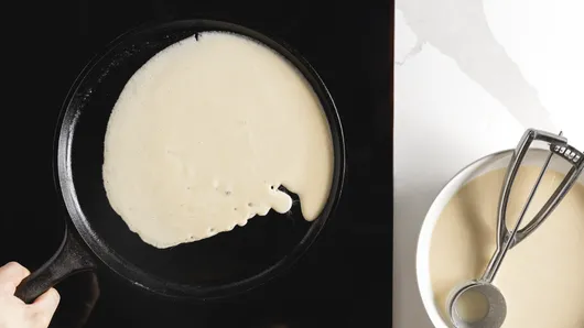 Step2Lightly butter 6- to 8-inch skillet or crepe pan. Heat over medium heat until bubbly. For each crepe, pour slightly less than 1/4 cup batter into skillet. Immediately tilt and rotate skillet so thin layer of batter covers bottom. Cook until light brown. Run wide spatula around edge to loosen; turn and cook other side until light brown. Repeat with remaining batter, buttering skillet as needed.