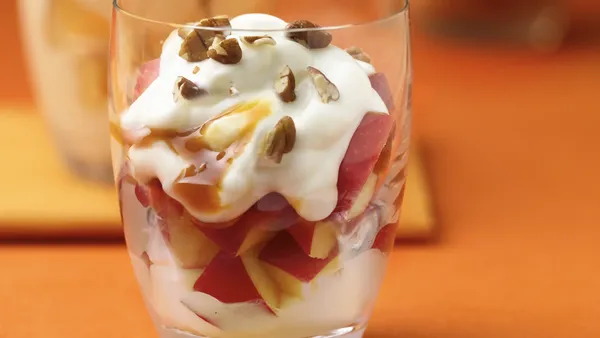 Step2Into each of 3 parfait glasses or clear drinking glasses, spoon 1 tablespoon yogurt. Place 6 strawberry slices and 2 apple chunks over yogurt in each glass. Sprinkle each with 1/4 cup cereal. Spoon about 1/3 cup yogurt over cereal.
