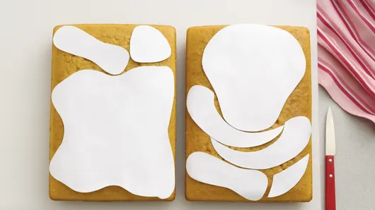 Cut cake around templates. (Discard cake pieces cut from around templates, or save for another use.) Arrange cake pieces on tray as shown. Freeze 1 hour for easier frosting.