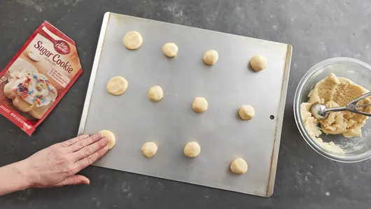 Step2In large bowl, mix cookie mix, butter and egg with spoon until soft dough forms. Shape into 24 (1 1/4 inch) balls; place on ungreased large cookie sheets 2 inches apart. Flatten slightly.