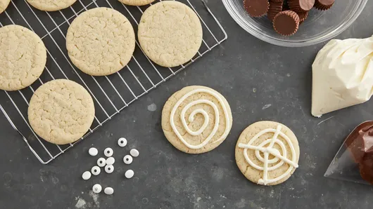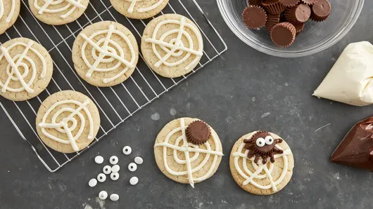 Step4Spoon vanilla frosting into small resealable freezer plastic bag; partially seal bag. Cut small tip from one corner of bag. Working from center to outer edge, pipe frosting to form spiral design on top of cookie. Working from center of spiral to outer edge, pipe several lines to form web design.