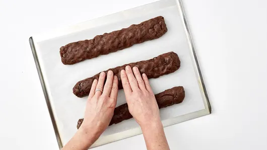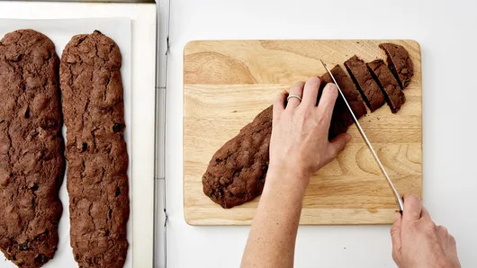 Bake 25 to 30 minutes or until set, but still slightly soft. Place baking sheet on cooling rack; cool completely, about 1 hour. Transfer to cutting board and, with serrated knife, cut logs crosswise into 1/2-inch slices. Place slices cut side down on ungreased large cookie sheets, 1/2 inch apart.