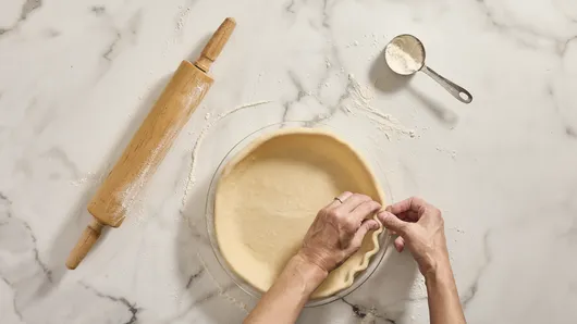 Gather pastry into a ball. Shape into flattened round on lightly floured surface. Wrap in plastic wrap; refrigerate about 45 minutes or until dough is firm and cold, yet pliable. This allows the shortening to become slightly firm, which helps make the baked pastry more flaky. If refrigerated longer, let pastry soften slightly before rolling.