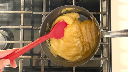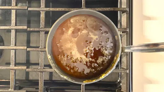Step5Prepare caramel drizzle by placing a saucepan over medium heat. Slowly add granulated sugar to the pan, 1/4 cup at a time, waiting for sugar to dissolve before adding more. Stir occasionally until the sugar has become a deep caramel color, then turn off the heat. Slowly mix in the 6 tablespoons butter, 2 tablespoons at a time, then stir in heavy cream and salt. Allow the mixture to cool slightly and then transfer to a squeeze bottle.