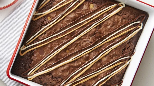 Step4In microwavable container, microwave 1/2 cup white chocolate chunks and the oil uncovered on High 30 to 60 seconds, stirring once or twice, until thin enough to drizzle. Place in small plastic food-storage bag; cut small hole in corner of bag. Drizzle over frosting. For brownies, cut into 6 rows by 4 rows.