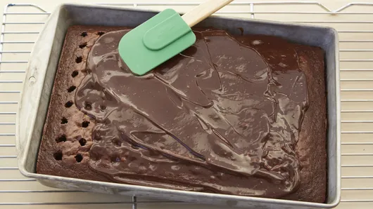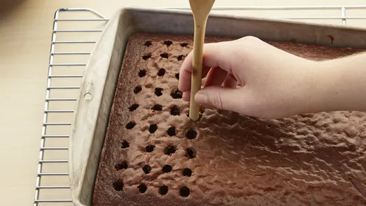 Step3Bake 28 to 33 minutes or until toothpick inserted in center comes out clean. Cool in pan on cooling rack 5 minutes. With handle of wooden spoon (1/2 inch in diameter), poke holes almost to bottom every 1/2 inch, wiping spoon handle occasionally with paper towel to reduce sticking.