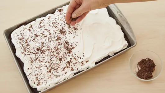 Step5When ready to serve, drop whipped topping by spoonfuls over cake; spread evenly. Sprinkle with chocolate shavings. Cut into 5 rows by 3 rows. Store loosely covered in refrigerator.