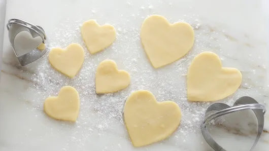 Divide the dough in half. On lightly floured surface, roll each half of the dough to 1/8-inch thickness. With 3-inch and 1 1/2-inch heart-shaped cookie cutters, cut 12 cutouts of each size. Place 2 inches apart on ungreased cookie sheets.