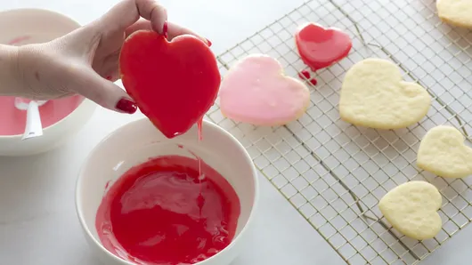 Place a small heart cookie on top of each large heart cookie. Top with sprinkles. Let stand at room temperature until set, about 1 hour.