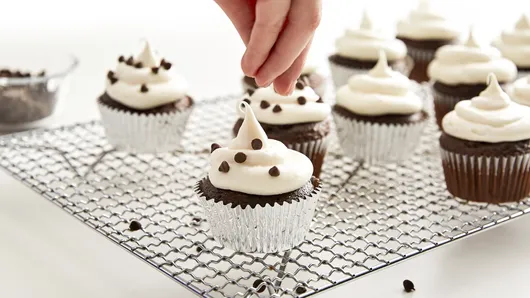 Step3Sprinkle chocolate chips on top of each cupcake. Store loosely covered at room temperature.