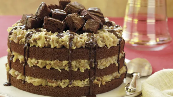Step2Place 1 cake layer, rounded side down, on serving plate. Spread with about 1/3 cup frosting. Top with second layer, rounded side up. Frost side of cake and spread a thin layer of frosting on top of cake. Make a basket weave pattern in frosting on side of cake by drawing inch-long horizontal and vertical lines with tines of fork.