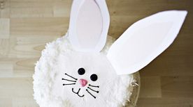 Frost and Fluff: Using the tub of fluffy white frosting, frost the cake and sprinkle with the coconut, to look like a fluffy bunny.
