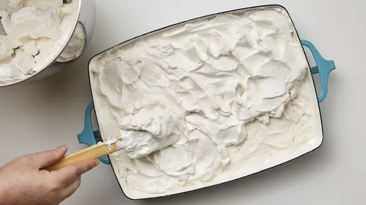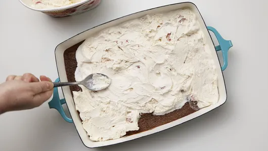 Step3Evenly spread softened strawberry ice cream on top of cooled brownie. Place in freezer while making meringue.