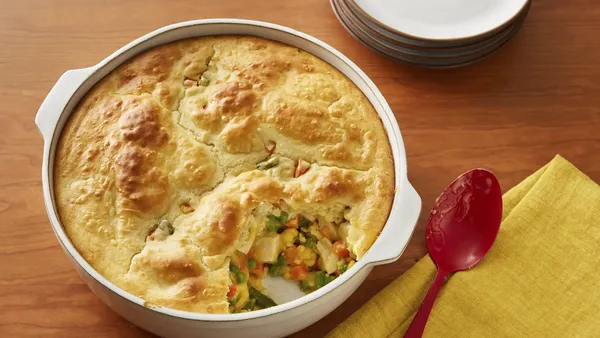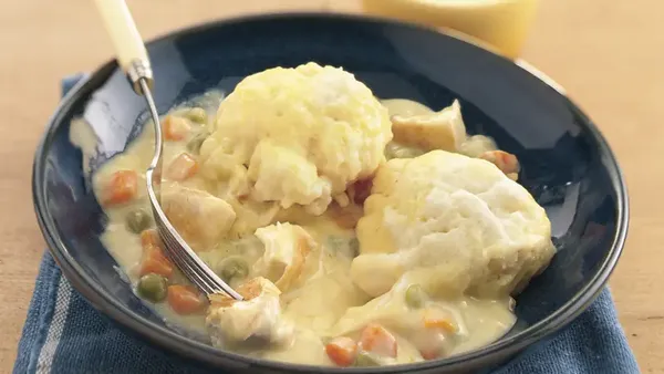 var configuration = {"title":"Easy Chicken Pot Pie","introduction":"\u003cp\u003eChicken pot pie is a classic family favorite, with its warm, creamy chicken and veggies tucked inside a tasty crust. It’s particularly satisfying on those nights when there’s a chill in the air. \u003c/p\u003e\n\u003cp\u003ePot pies can be time consuming to make, if you are mixing and rolling out scratch pie pastry, creating a scratch sauce, and chopping fresh veggies. Our 10-minute prep easy pot pie recipe streamlines the work so that making a pot pie is easy for any night of the week! How is it made easier? Our recipe starts with frozen veggies and canned condensed soup for the sauce which slashes loads of prep time, but it doesn’t stop there. Our batter, made with Bisquick™, forms a top and bottom crust while it bakes, so you don’t need to make pie pastry.\u003c/p\u003e \n\u003cp\u003eThis easy to prepare favorite is a natural choice for supper when the nights turn chilly. It’s also a terrific way to use up your holiday bird, when you have leftovers. Cooked turkey can be substituted for the chopped cooked chicken with equally delicious results. Whether you’ve earned a golden spoon for your cooking or it’s your very first time making one, your pot pie will turn out perfectly every time.\u003c/p\u003e","servingSize":"1 Serving","image":{"small":{"media":"(min-width: 0px)","src":"https://mojo.generalmills.com/api/public/content/DB3XhEZM50qqNDy311-jMw_webp_base.webp?v=71b02885\u0026t=e724eca7b3c24a8aaa6e089ed9e611fd"},"medium":{"media":"(min-width: 500px)","src":"https://mojo.generalmills.com/api/public/content/DB3XhEZM50qqNDy311-jMw_webp_base.webp?v=71b02885\u0026t=191ddcab8d1c415fa10fa00a14351227"},"large":{"media":"(min-width: 767px)","src":"https://mojo.generalmills.com/api/public/content/DB3XhEZM50qqNDy311-jMw_webp_base.webp?v=71b02885\u0026t=191ddcab8d1c415fa10fa00a14351227"},"alt":"Easy Chicken Pot Pie"},"contributor":{"label":"By","name":"Betty Crocker Kitchens","profileUrl":"/about-us","displayDate":{"label":"Updated","date":"Sep 17, 2024"}},"ingredientGroups":[{"ingredients":[{"quantity":"1 1/2","description":"cups frozen mixed vegetables, thawed"},{"quantity":"1","description":"cup chopped cooked chicken"},{"quantity":"1","description":"can (10 1/2 oz) condensed cream of chicken soup"},{"quantity":"1","description":"cup Bisquick™ Original Pancake \u0026 Baking Mix","productLink":"/products/bisquick/bisquick-original"},{"quantity":"1/2","description":"cup milk"},{"quantity":"1","description":"tablespoon vegetable oil"},{"quantity":"1","description":"egg"}]}],"steps":[{"description":"Heat oven to 375°F. Spray 9-inch pie plate with cooking spray. Add vegetables, chicken and soup; stir to mix."},{"description":"In medium bowl, stir remaining ingredients until blended. Pour into pie plate."},{"description":"Bake uncovered 29 to 33 minutes or until crust is deep golden brown."}],"tips":[{"title":"","description":"Betty Crocker Easy Chicken Pot Pie recipe is a comforting, family dinner idea that’s a cinch to make because it starts with Bisquick™ Original baking mix.","category":"Rich Snippet","tipShots":[]},{"title":"","description":"To quickly thaw the frozen vegetables, place in colander or strainer; rinse with warm water until thawed. Drain well.","category":"Method Note","tipShots":[]},{"title":"","description":"Leftover chicken from a deli rotisserie bird or from a roast turkey can be used if you don\u0027t have any cooked chicken on hand.","category":"Substitution","tipShots":[]},{"title":"","description":"Bump the flavor quotient by seasoning the chicken and veggie mixture with your favorite blend of dried herbs—sage, basil, oregano, or dill.","category":"Variation","tipShots":[]},{"title":"","description":"Sprinkle the top of the crust with a little shredded cheese in the last 5 minutes of baking.","category":"Presentation/Garnish","tipShots":[]},{"title":"","description":"Kitchen Tested - 9/2022.","category":"Kitchen Tested","tipShots":[]}],"kitchenTips":[{"title":"","description":"To quickly thaw the frozen vegetables, place in colander or strainer; rinse with warm water until thawed. Drain well.","category":"Method Note","tipShots":[]},{"title":"","description":"Leftover chicken from a deli rotisserie bird or from a roast turkey can be used if you don\u0027t have any cooked chicken on hand.","category":"Substitution","tipShots":[]},{"title":"","description":"Bump the flavor quotient by seasoning the chicken and veggie mixture with your favorite blend of dried herbs—sage, basil, oregano, or dill.","category":"Variation","tipShots":[]},{"title":"","description":"Sprinkle the top of the crust with a little shredded cheese in the last 5 minutes of baking.","category":"Presentation/Garnish","tipShots":[]}],"additionalContent":[{"title":"How To Make Easy Chicken Pot Pie","description":"\u003cp\u003eLook at how easy it is to make this favorite, comforting casserole dinner! Follow the recipe for the specific directions:\u003c/p\u003e\n\u003ch3\u003e\u003cb\u003eMix the Filling\u003c/b\u003e\u003c/h3\u003e \n\u003cp\u003eIn a greased pie plate, mix the chicken pot pie filling recipe made with thawed frozen veggies, cut-up chicken, and the soup (straight out of the can).\u003c/p\u003e\n\u003ch3\u003e\u003cb\u003eMix the Crust Batter\u003c/b\u003e\u003c/h3\u003e\n\u003cp\u003eMix the Bisquick, milk, oil, and egg; pour over the chicken filling to magically form a bottom and top crust as the pot pie bakes.\u003c/p\u003e\n\u003c/h3\u003e\u003cb\u003eBake Until Golden Brown\u003c/b\u003e\u003c/h3\u003e \n\u003cp\u003eUse the color of the crust to indicate if it’s baked long. It should be a deep golden brown, add a minute or two more of bake time if it’s not.\u003c/p\u003e","category":"SEO Content_1","tipShots":[]},{"title":"Storing Leftovers","description":"\u003cp\u003eStore any remaining pot pie within 2 hours of serving it, to keep bacteria that can cause food-borne illness f