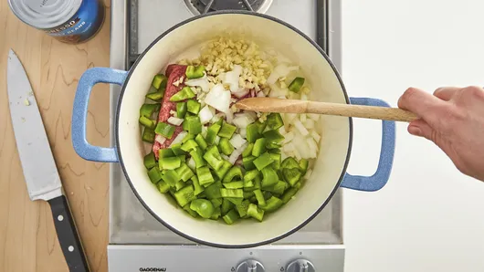 Spray 4-quart Dutch oven with cooking spray; heat over medium-high heat. Add beef, onions, green peppers and garlic; cook 5 to 7 minutes, stirring occasionally, until beef is thoroughly cooked. Drain.