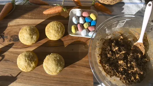 Spoon the mixture on top of the cupcakes, lightly pressing down and placing two chocolate eggs on top of each cupcake to form the nests. Enjoy!