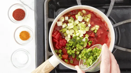 Step1In 2-quart saucepan, mix tomatoes, green onion whites, chiles, chili powder, red pepper and salt. Heat to simmering over medium heat.