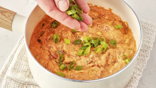 Step3Top with green onion greens; serve with chips.