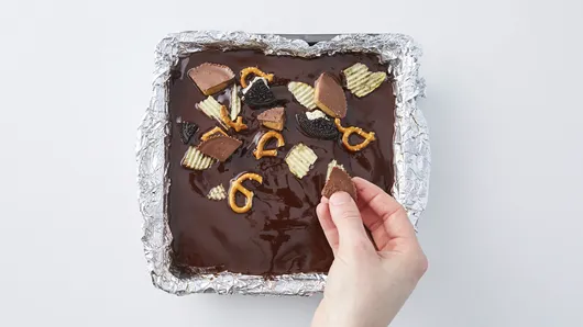 Step5Top with OREO cookies, potato chips, pretzel twists and peanut butter cups.