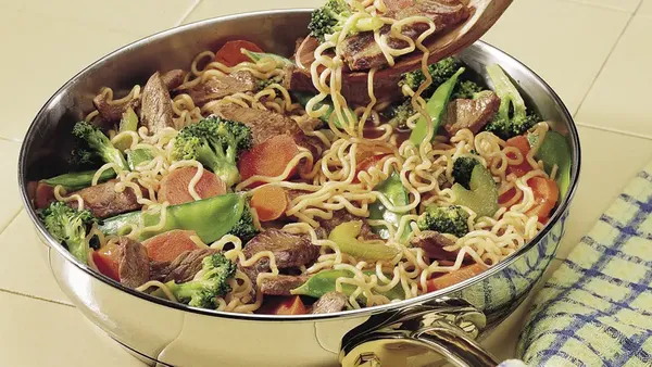 Step3Stir in contents of seasoning packet from soup mix, the stir-fry sauce and beef. Cook 2 to 3 minutes, stirring frequently, until hot. Serve in individual bowls.