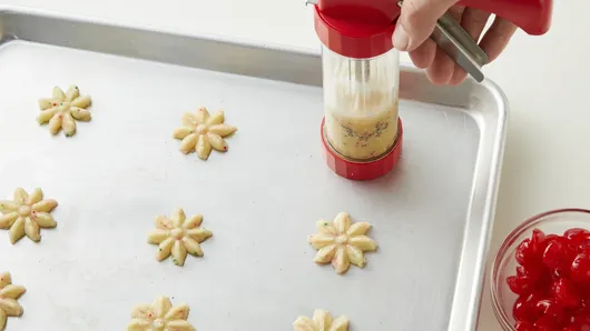 var configuration = {"title":"Easy Spritz Flowers","introduction":"Even if you didn’t grow up with a Scandinavian grandma who made buckets of these cookies every Christmas, spritz have a timeless appeal. With their buttery texture, bite size and almond flavoring, these cookies are just as good as you might remember. The only difference is this recipe is extra easy to make. The dough comes together with a couple of standard ingredients, including a package of Betty Crocker™ sugar cookie mix, and the charming decorations take minimal effort as well. Simply stir in red and green holiday nonpareils before pressing cookies and add a maraschino cherry center to complete the flower look. So while poinsettias are nice at Christmastime, we think an edible arrangement of these spritz would be even nicer when you need a host gift or Christmas present.","servingSize":"1 Cookie","image":{"small":{"media":"(min-width: 0px)","src":"https://mojo.generalmills.com/api/public/content/_nyUJNlJ9EuZ65YWq77SDQ_webp_base.webp?v=064aaaec\u0026t=e724eca7b3c24a8aaa6e089ed9e611fd"},"medium":{"media":"(min-width: 500px)","src":"https://mojo.generalmills.com/api/public/content/_nyUJNlJ9EuZ65YWq77SDQ_webp_base.webp?v=064aaaec\u0026t=191ddcab8d1c415fa10fa00a14351227"},"large":{"media":"(min-width: 767px)","src":"https://mojo.generalmills.com/api/public/content/_nyUJNlJ9EuZ65YWq77SDQ_webp_base.webp?v=064aaaec\u0026t=191ddcab8d1c415fa10fa00a14351227"},"alt":"Easy Spritz Flowers"},"contributor":{"label":"By","name":"Betty Crocker Kitchens","profileUrl":"/about-us","displayDate":{"label":"Updated","date":"Aug 12, 2019"}},"ingredientGroups":[{"ingredients":[{"quantity":"1","description":"pouch (17.5 oz) Betty Crocker™ Sugar Cookie Mix","productLink":"/products/cookiemix/sugar"},{"quantity":"1/3","description":"cup Gold Medal™ all-purpose flour"},{"quantity":"1/2","description":"cup butter, melted"},{"quantity":"1","description":"teaspoon almond extract"},{"quantity":"1","description":"egg"},{"quantity":"1","description":"tablespoon Betty Crocker™ Decorating Decors Jingle Mix nonpareils (from 2.1-oz container)"},{"quantity":"38","description":"maraschino cherries, drained well, patted dry, cut in half"}]}],"steps":[{"description":"Heat oven to 375°F. In large bowl, stir cookie mix, flour, melted butter, almond extract and egg until dough forms. Stir in nonpareils.","stepShotImageUrl":"//mojo.generalmills.com/api/public/content/uDeyoRzShkiNAFkda-MRyg_webp_base.webp?v=ae65e1f5\u0026t=51a43a57af4046789e5a7f20567b1195"},{"description":"Place 1 3/4-in flower design disk in cookie press. Place dough in press; press dough through, and press onto ungreased cookie sheets. Place halved cherry in center. Repeat with remaining dough and cherries. (Keep dough covered with plastic wrap while not using to prevent drying out.)","stepShotImageUrl":"//mojo.generalmills.com/api/public/content/Xc6DkRDATkCcFD8KKaAPGw_webp_base.webp?v=367ba664\u0026t=51a43a57af4046789e5a7f20567b1195"},{"description":"Bake 5 to 7 minutes or until edges are set but not brown. Cool 1 minute; remove from cookie sheets to cooling rack. Cool completely, about 30 minutes. Store covered in airtight container at room temperature with waxed paper between layers."}],"tips":[{"title":"","description":"In baking, it’s always important to measure flour accurately, but even more so when making spritz. With too much flour, dough will become dry and difficult to press. With too little, it will be sticky and cookies will spread all over the pan. In either scenario, the dough will be difficult to press. The best way to measure flour for baking success is to: Stir, spoon into measuring cup filling until heaping, and finally, sweep the excess off the top with the flat edge of a butter knife.","category":"Techniques","tipShots":[]},{"title":"","description":"Stir nonpareils into the dough after it is already mixed to prevent colors from bleeding.","category":"Techniques","tipShots":[]},{"title":"","description":"When filling your cookie press canister, follow manufacturer’s instructions. It will be easier to press out shapes if your canister is not overfull.","category":"Techniques","tipShots":[]},{"title":"","description":"Pat cherries dry before chopping to prevent excess juice on cookie dough. Kitchen shears make it extra easy to cut cherries in half.","category":"Techniques","tipShots":[]},{"title":"","description":"Making spritz cookies is a little like making pancakes. Usually, it’s not until the second or third that you get your technique just right. If your first couple of cookies don’t turn out as nicely shaped as you’d like, simply scrape them back into your dough ball, and try again.","category":"Techniques","tipShots":[]},{"title":"","description":"For best results, bake cookies on the middle oven rack. For even baking, it’s best to bake one sheet at a time. Always allow cookie sheets to cool completely in between batches. Cookies will spread too much if placed on a hot or even warm cookie sheet. Spritz have a short bake time, so keep an eye on your bake time, and don’t forget to set a timer as soon as you put them in the oven.","category":"Techniques","tipShots":[]},{"title":"","description":"If only scratch will do for you, don’t miss out on our \u003ca href=\u0022https://www.bettycrocker.com/recipes/classic-spritz-cookies/aa68df04-bd64-4f1b-8421-0df82064bca4\u0022 target=\u0022_blank\u0022\u003eClassic Spritz recipe\u003c/a\u003e. And those who love trying something new will find all sorts of variations among our \u003ca href=\u0022https://www.bettycrocker.com/recipes/dishes/cookie-recipes/spritz-cookies\u0022 target=\u0022_blank\u0022\u003eSpritz Cookies recipes\u003c/a\u003e.","category":"Editorial","tipShots":[]},{"title":"","description":"Kitchen Tested: 6/2019","category":"Kitchen Tested","tipShots":[]}],"kitchenTips":[{"title":"","description":"In baking, it’s always important to measure flour accurately, but even more so when making s