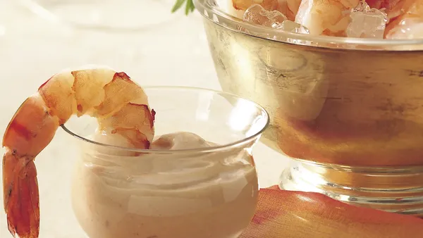 Craving a bit of the tropics? Start with precooked shrimp dipped in a mixture of preserves and mustard.