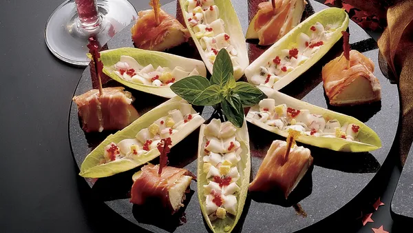 Step1Spread about 1 teaspoon cream cheese inside each endive leaf.