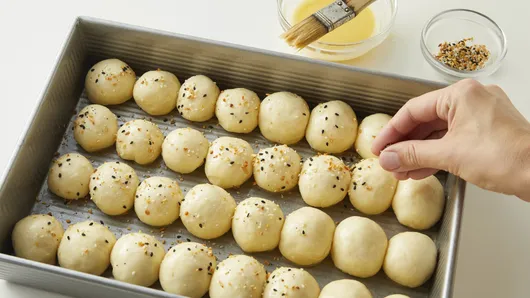 var configuration = {"title":"Everything Bagel Dinner Rolls","introduction":"Dry and tasteless dinner rolls? Banish the thought! You can bake up soft and chewy dinner rolls full of savory flavor with this recipe. Topped with a seasoning mix inspired by the iconic everything bagel, these rolls have notes of onion, garlic, sesame, poppy seed and sea salt, which means they go with whatever you’re having for dinner. And keep in mind—the dough can be made the day ahead! So, keep this recipe around for the holidays and dinner parties, because nothing pleases or impresses quite like a hot-from-the-oven dinner roll.","servingSize":"2 Rolls","image":{"small":{"media":"(min-width: 0px)","src":"https://mojo.generalmills.com/api/public/content/_5gpqzZi7kGTE5amL2zuDg_webp_base.webp?v=ccc0305a\u0026t=e724eca7b3c24a8aaa6e089ed9e611fd"},"medium":{"media":"(min-width: 500px)","src":"https://mojo.generalmills.com/api/public/content/_5gpqzZi7kGTE5amL2zuDg_webp_base.webp?v=ccc0305a\u0026t=191ddcab8d1c415fa10fa00a14351227"},"large":{"media":"(min-width: 767px)","src":"https://mojo.generalmills.com/api/public/content/_5gpqzZi7kGTE5amL2zuDg_webp_base.webp?v=ccc0305a\u0026t=191ddcab8d1c415fa10fa00a14351227"},"alt":"Everything Bagel Dinner Rolls"},"contributor":{"label":"By","name":"Betty Crocker Kitchens","profileUrl":"/about-us","displayDate":{"label":"Updated","date":"Jul 31, 2019"}},"ingredientGroups":[{"name":"Rolls","ingredients":[{"quantity":"1/2","description":"cup water"},{"quantity":"1/2","description":"cup milk"},{"quantity":"4","description":"tablespoons butter"},{"quantity":"1/4","description":"cup sugar"},{"quantity":"3","description":"cups Gold Medal™ all-purpose flour"},{"quantity":"1","description":"teaspoon salt"},{"quantity":"1","description":"package regular active or fast-acting dry yeast (2 1/4 teaspoons)"},{"quantity":"1","description":"egg"}]},{"name":"Topping","ingredients":[{"quantity":"1","description":"egg, beaten"},{"quantity":"1","description":"tablespoon water"},{"quantity":"1","description":"tablespoon everything bagel seasoning"}]}],"steps":[{"description":"In 1 1/2-quart saucepan, mix 1/2 cup water, the milk, butter and sugar. Heat just to simmering over medium-high heat. Cool until instant-read thermometer inserted in mixture reads 120°F to 130°F. In large bowl, mix flour, salt and yeast. Add water mixture and 1 egg to flour mixture; stir until just combined."},{"description":"Sprinkle flour lightly on work surface. Place dough on floured surface. Knead by folding dough toward you, then with heels of your hands, pushing dough away from you with a short rocking motion. Move dough a quarter turn, and repeat. Continue kneading about 5 minutes, sprinkling surface with more flour if dough starts to stick, until dough is smooth and springy.","stepShotImageUrl":"//mojo.generalmills.com/api/public/content/JkbjvipGc0WV3JDmpjRcbA_webp_base.webp?v=1f67631e\u0026t=51a43a57af4046789e5a7f20567b1195"},{"description":"Spray large bowl with cooking spray. Place dough in bowl, turning dough to grease all sides. Cover bowl loosely with plastic wrap; let rise in warm place about 1 hour or until dough has doubled in size. Dough is ready if indentation remains when you press your fingertips about 1/2 inch into dough.","stepShotImageUrl":"//mojo.generalmills.com/api/public/content/rE44Iy4CxE-sXTfVesi0pA_webp_base.webp?v=6a62f35e\u0026t=51a43a57af4046789e5a7f20567b1195"},{"description":"Spray bottom and sides of 13x9-inch pan with cooking spray. Gently push your fist into dough to deflate it. Divide dough into 32 equal pieces. Shape each piece into a ball; place in pan.","stepShotImageUrl":"//mojo.generalmills.com/api/public/content/JyFizkXc7kmmfnGFfpAnhQ_webp_base.webp?v=419937cb\u0026t=51a43a57af4046789e5a7f20567b1195"},{"description":"Mix beaten egg and 1 tablespoon water; brush dough with egg wash. Sprinkle with seasoning. Lightly spray sheet of plastic wrap with cooking spray; cover pan loosely with plastic wrap, sprayed side down. Let rise in warm place about 40 minutes or until dough has doubled in size. Remove plastic wrap.","stepShotImageUrl":"//mojo.generalmills.com/api/public/content/H5hqyBmda0mCpkv8wjvIYA_webp_base.webp?v=426f7e48\u0026t=51a43a57af4046789e5a7f20567b1195"},{"description":"Move oven rack to low position so top of pan will be in center of oven. Heat oven to 375°F. Bake 15 to 18 minutes or until golden brown. Remove from pan to cooling rack. Serve warm or cooled."},{"description":"Make Ahead: After dough has risen in bowl, cover tightly with foil; refrigerate 4 to 24 hours. Before baking, remove foil and cover loosely with plastic wrap. Let rise in warm place about 2 hours or until dough has doubled in size. If some rising occurred in refrigerator, rising time may be less than 2 hours. Shape and bake as directed."}],"tips":[{"title":"","description":"Kitchen Tested: 6/2019","category":"Kitchen Tested","tipShots":[]},{"title":"","description":"The egg wash helps the buns brown nicely and the seasoning to stick.","category":"Techniques","tipShots":[]},{"title":"","description":"If you’d like to make this recipe ahead, prep the dough the day before. Then, all you have to do is shape rolls, let them rise and bake. By the way, this is a great job for a kitchen helper!","category":"Do-Ahead","tipShots":[]},{"title":"","description":"Everything bagel inspired seasoning can be purchased at some large grocery stores. If it’s not available in your area, make your own by combining: 1 teaspoon dried chopped onion, 1 teaspoon dried minced garlic, 1 teaspoon poppy seed, 1 teaspoon sesame seed and 1/4 teaspoon salt.","category":"Variation","tipShots":[]}],"kitchenTips":[{"title":"","description":"The egg wash helps the buns brown nicely and the seasoning to stick.","category":"Techniques","tipShots":[]},{"title":"","description":"If you’d like to make this recipe ahead, prep the dough the day before. Then, all you have to do is shape rolls, let them rise and bake. By the way, 