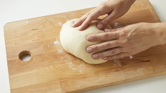 Sprinkle flour lightly on work surface. Place dough on floured surface. Knead by folding dough toward you, then with heels of your hands, pushing dough away from you with a short rocking motion. Move dough a quarter turn, and repeat. Continue kneading about 5 minutes, sprinkling surface with more flour if dough starts to stick, until dough is smooth and springy.