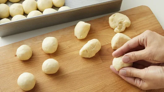 Spray bottom and sides of 13x9-inch pan with cooking spray. Gently push your fist into dough to deflate it. Divide dough into 32 equal pieces. Shape each piece into a ball; place in pan.