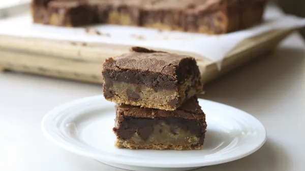 Combine two classic desserts into one irresistible treat: the Brookie! This recipe merges the best of cookies and brownies into a delightful and scrumptious dessert. Just like how good friends with unique personalities complement each other, these sweets are wickedly better together for a fun and delightful experience that will tantalize your taste buds. Our easy-to-make brookies are served with green and pink candy sprinkles stirred in for a fun and colorful treat.