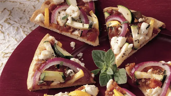 Step2Sprinkle with vegetables and cheese. Cut into 1 1/2-inch diamond shapes.