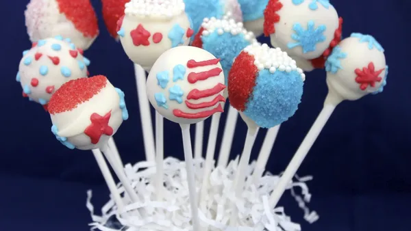 Step5Place cake on cooling rack over waxed paper or cooking parchment paper. In small microwavable bowl, place 1/4 cup of the frosting. Microwave uncovered on High 10 to 15 seconds or until thin enough to drizzle over cake. With spoon, drizzle warmed frosting back and forth over cake in striping pattern. Divide remaining frosting between 2 small microwavable bowls. To 1 bowl, stir in 1/4 teaspoon red food color until well blended. Microwave uncovered on High 5 to 10 seconds or until thin enough to drizzle. Drizzle over cake. Repeat with remaining bowl of frosting and 1/4 teaspoon blue food color. Sprinkle candy sprinkles on top. Let stand about 30 minutes or until frosting is set. Store loosely covered at room temperature.