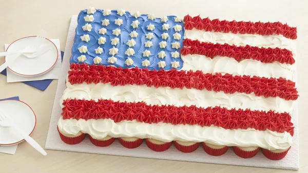 Step3For flag design, arrange blueberries on upper left corner of frosted cake to create stars; arrange strawberries in rows over frosted cake to create stripes. Serve immediately. Store covered in refrigerator.