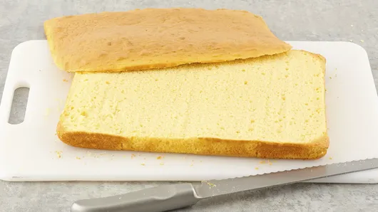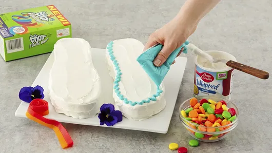 Step3Using serrated knife, cut rounded top off cake to level surface; place cut side down. Cut cake lengthwise in half. Continue cutting each piece to form flip-flop shape. (See link below for diagram and template.) Place pieces on tray. Spread a thin layer of frosting for "sides" over each entire flip-flop to seal in crumbs. Refrigerate or freeze cake 30 to 60 minutes to set frosting. Frost sides of flip-flops with the same remaining frosting. Frost tops of flip-flops with second color frosting.
