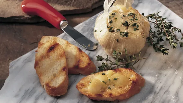 Fresh garlic is drizzled with olive oil and sprinkled with herbs, then grilled and squeezed over warm focaccia - Mmm!