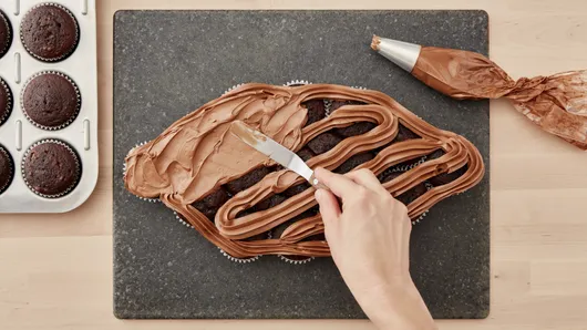 Pipe a thick border around the top of the football shape, then continue piping along the shape toward the center (the lines don't need to connect; this will happen when you spread the frosting). Use an icing spatula to spread the frosting, covering the cupcakes.